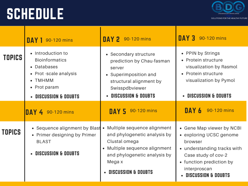 To cater to the need of a huge demand we have launched our next 7-day Training in Bioinformatics | A Perfect Guide for Beginners from Basics to Advanced in which every day 2-hour interactive training session on Google Meet/Zoom will be conducted to give the user a unique learning experience. Video recording will be provided at the end of the session to give the user a unique learning experience. On successful completion of the course participation certificate will be awarded.