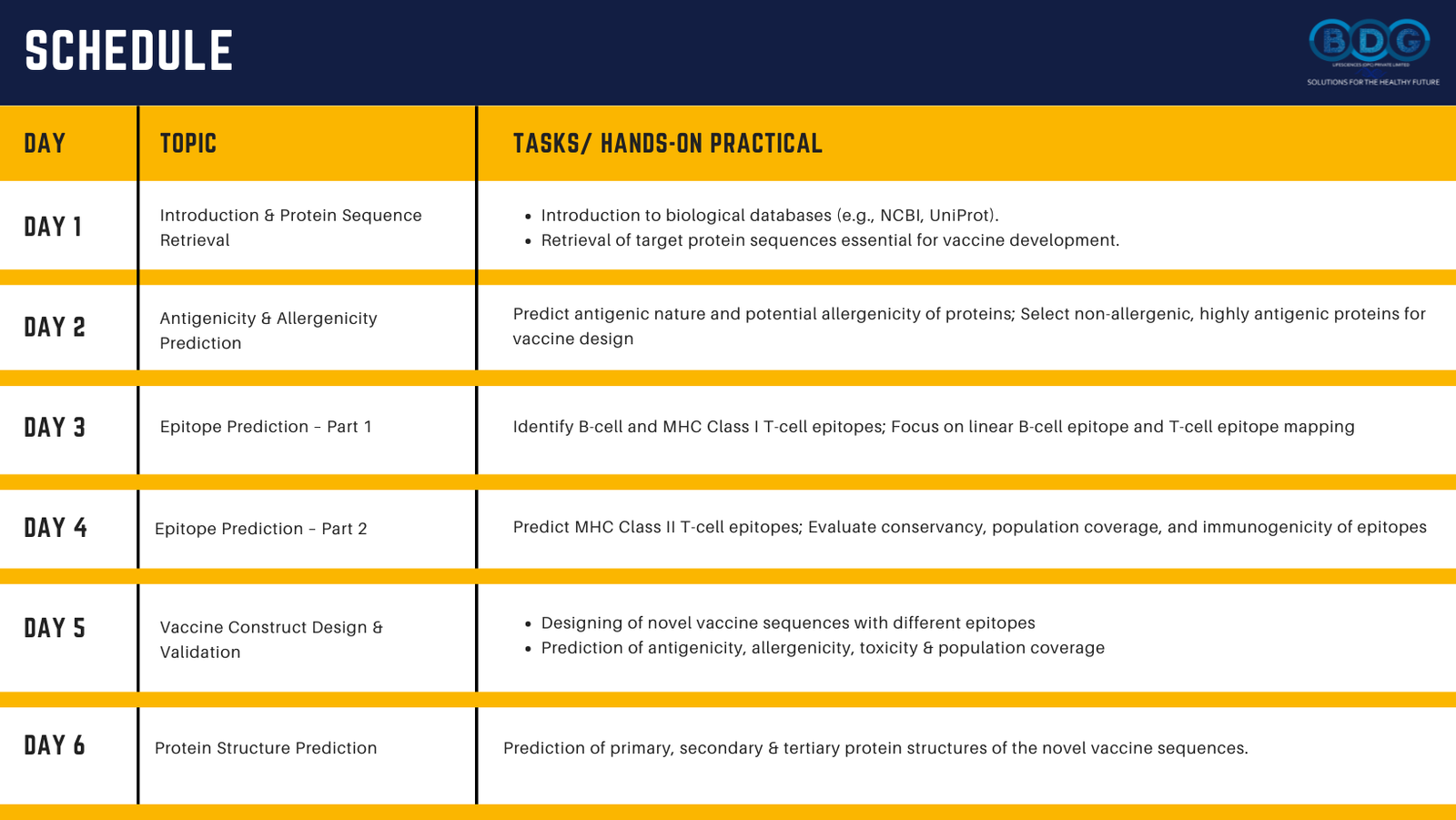 All 10 sessions of this workshop are delivered by BDG Lifesciences' specialist team of computational biologists and bioinformaticians with hands-on research expertise in reverse vaccinology, immunoinformatics, multi-epitope vaccine design, 3D structural analysis, molecular docking, and mRNA vaccine construct design.