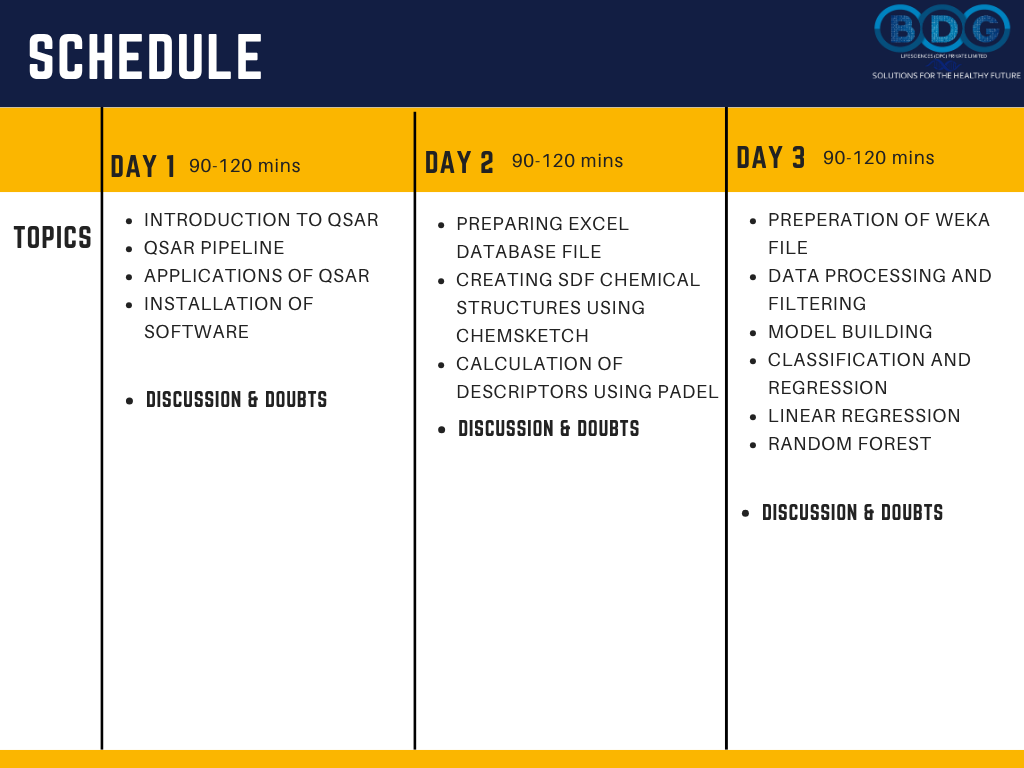 ⏱️ 90–120 Mins Live Daily- Five days of focused, interactive live sessions — each session building progressively from QSAR fundamentals through to 3D QSAR model building and new analogue prediction.