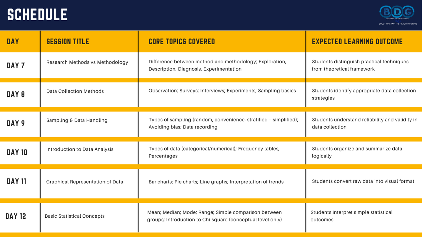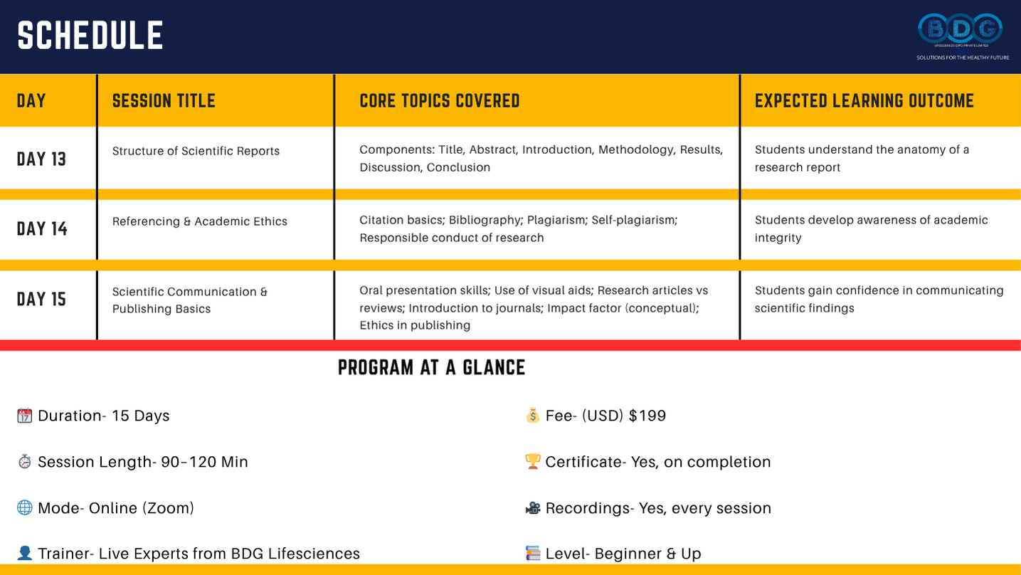 BDG LifeSciences — a globally recognized, MSME-registered life sciences training organization with over 16 years of expertise — has designed this 15-Day Certificate Online Training Program in Research Methodology to bridge that exact gap. Originally developed for high school students and now open to anyone who wants to build strong, foundational research skills, this program takes you step-by-step through the complete research process — from the very first question to the final published report.