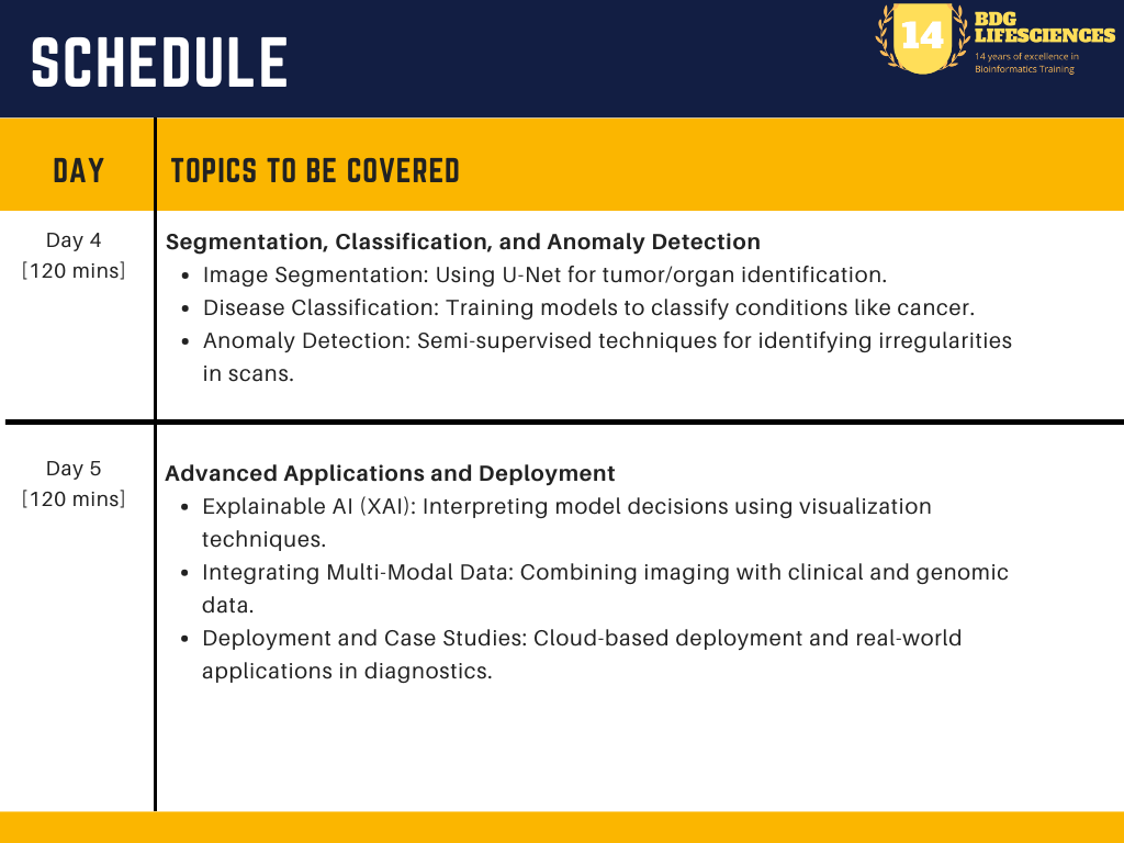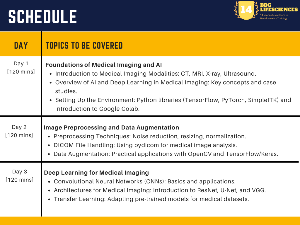 TOPICS/MODULES COVERED IN THIS TRAINING: The training program dives into the integration of AI in medical imaging, encompassing preprocessing, deep learning model development, segmentation, classification, anomaly detection, and deployment in clinical settings. Participants will gain expertise in tools like TensorFlow, PyTorch, and MONAI, along with hands-on experience in handling datasets such as DICOM, CT, MRI, and X-ray images