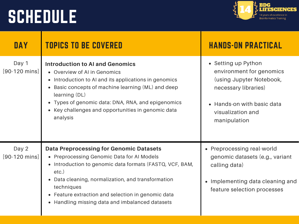 - Hands-on Experience with Genomic Data Analysis: Gain practical experience using real-world genomic data from public repositories and applying AI algorithms to solve complex problems in genomics.