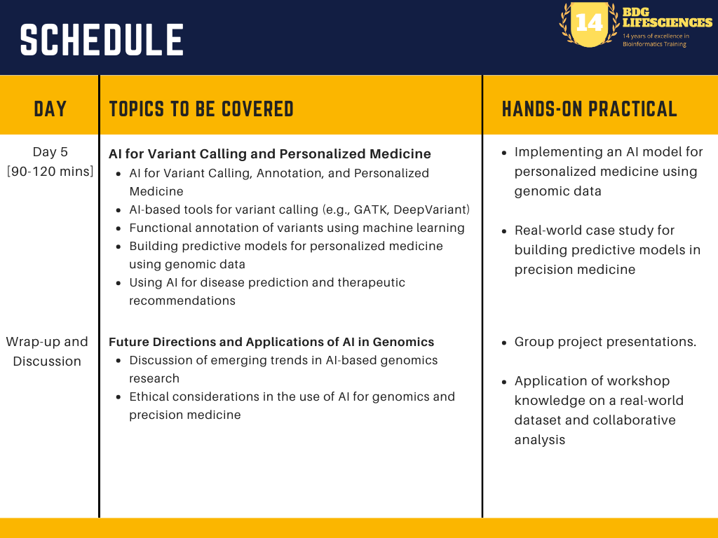 This 5-day Technical Hands-on program explores the integration of Artificial Intelligence (AI) in genomics. Participants will learn how AI techniques, including machine learning and deep learning, are applied to genomic data analysis, variant calling, gene expression analysis, and personalized medicine, enhancing understanding and advancements in genomics research.