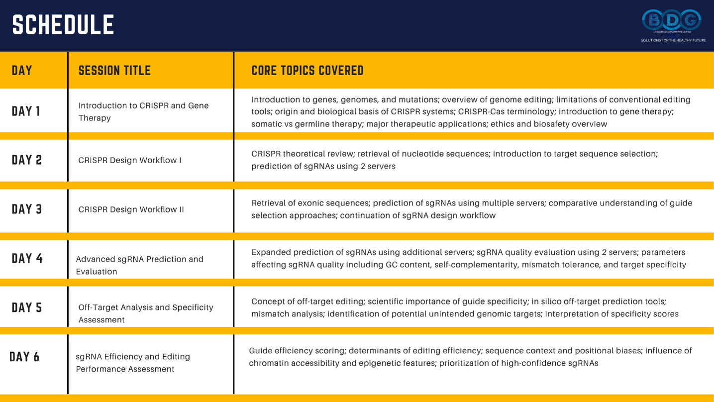 This programme has been expanded from its earlier 5-day format into a comprehensive 10-day structure to provide greater depth, better workflow continuity, and stronger practical orientation. Each session runs for 60–90 minutes with the BDG LifeSciences Technical Team delivering live, expert instruction via Zoom. Participants work directly on in silico CRISPR design tools — not passive slides — using real genomic sequences, multiple prediction servers, and real-world disease targets.
