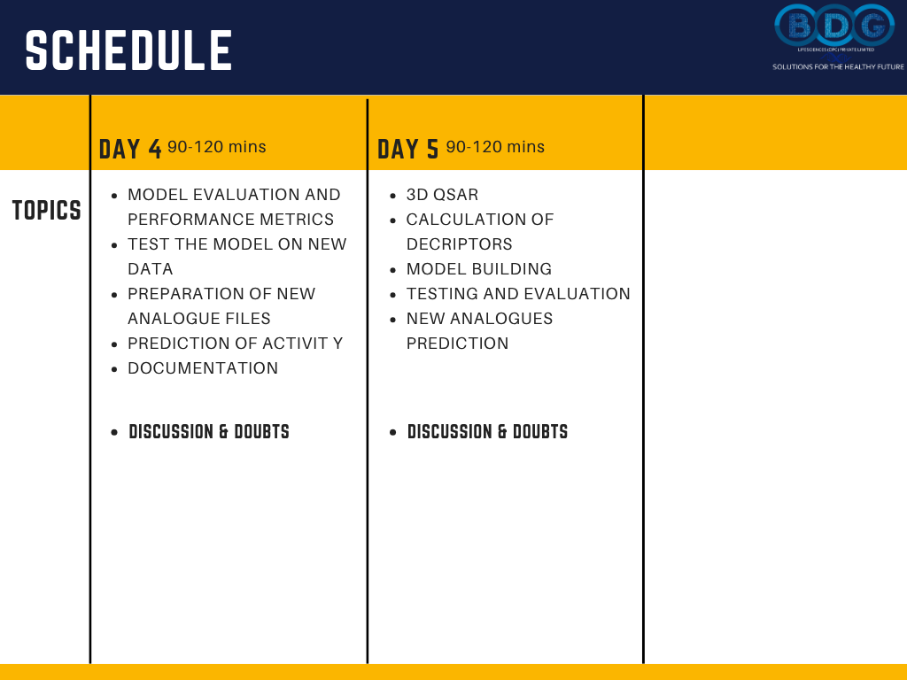 ⏱️ 90–120 Mins Live Daily- Five days of focused, interactive live sessions — each session building progressively from QSAR fundamentals through to 3D QSAR model building and new analogue prediction.