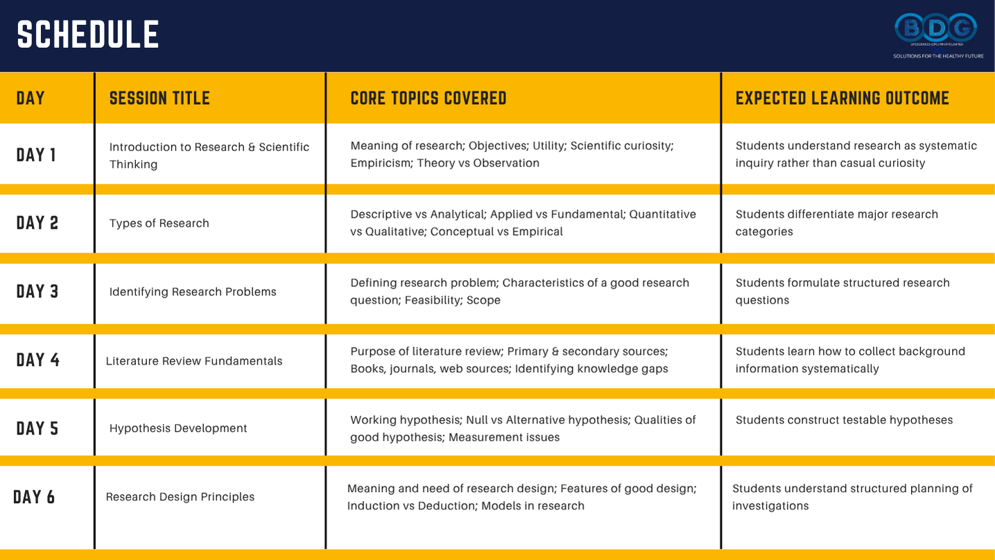 Q. What is this research methodology training program about? This is a 15-Day Certificate Online Training Program in Research Methodology, conducted live by expert trainers at BDG LifeSciences. It covers every step of the research process — from scientific thinking and types of research, through hypothesis writing, literature review, research design, data collection, data analysis, statistical concepts, scientific report writing, academic ethics, and scientific communication. Each session runs for 90–120 minutes on Zoom with a live trainer, and recordings are shared after every class. |